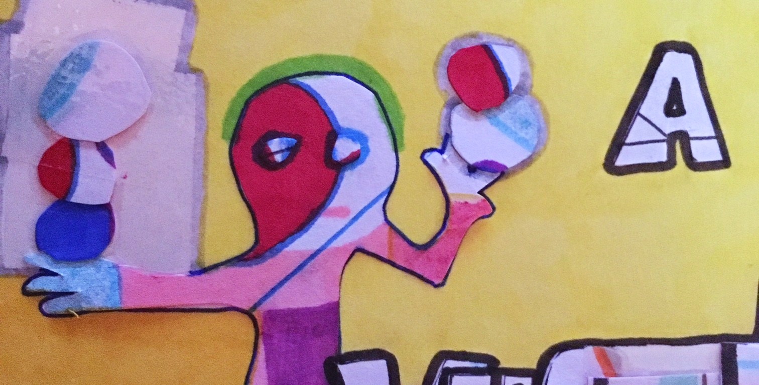 Here’s one of my funny little doodle collages. I use chance methods to create my drawings, collages and paintings.