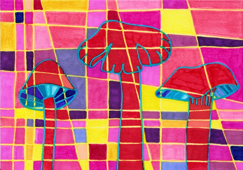 Fungi Fantasy: In a whimsical departure from pure geometry, the third drawing introduces an unexpected element β mushrooms! These charming fungi emerge from the abstract landscape, injecting a playful and organic dimension into the composition. What stories do these mushrooms tell?