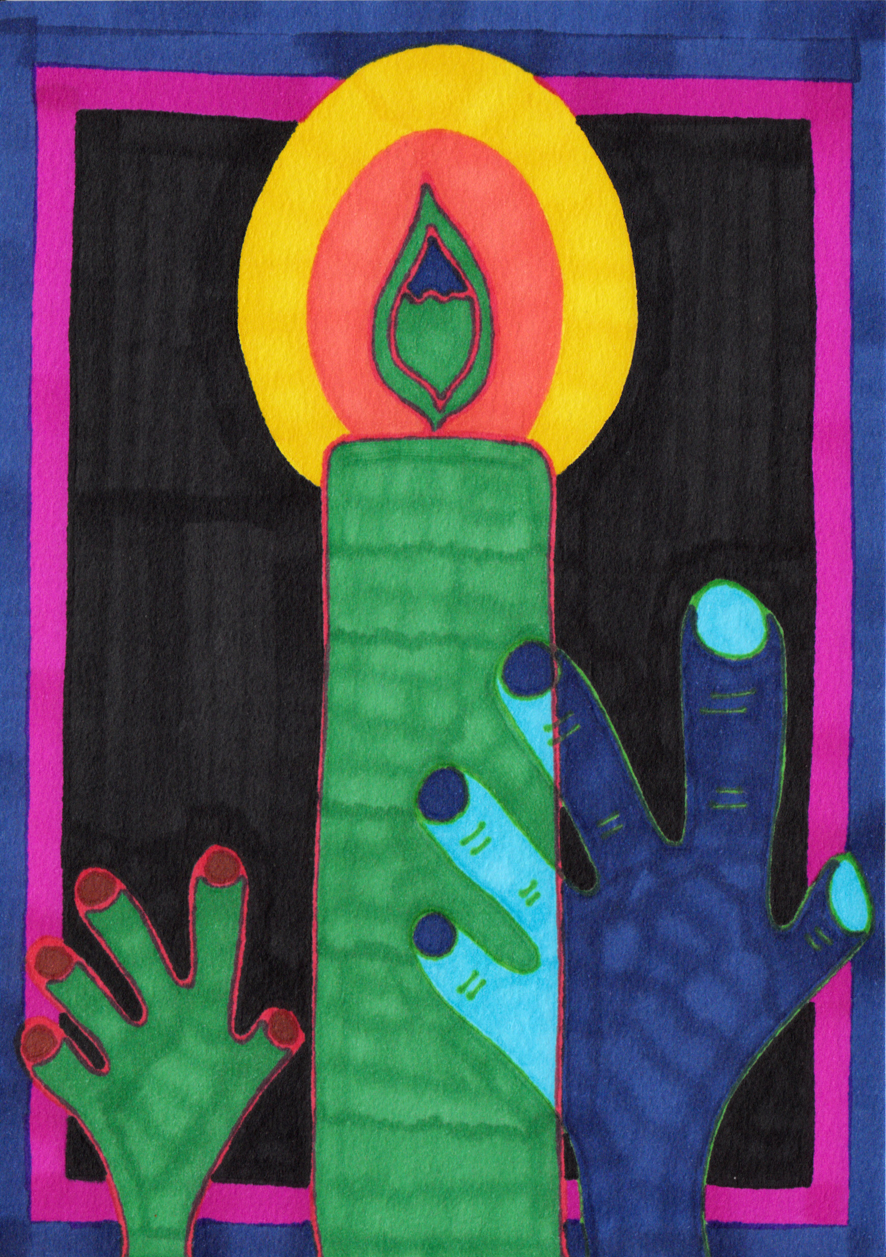 Embracing the Flame: In a scene of quiet contemplation, two hands reach towards the flickering flame of a candle. Executed with precision on A5 card, this drawing captures the delicate balance between curiosity and reverence.