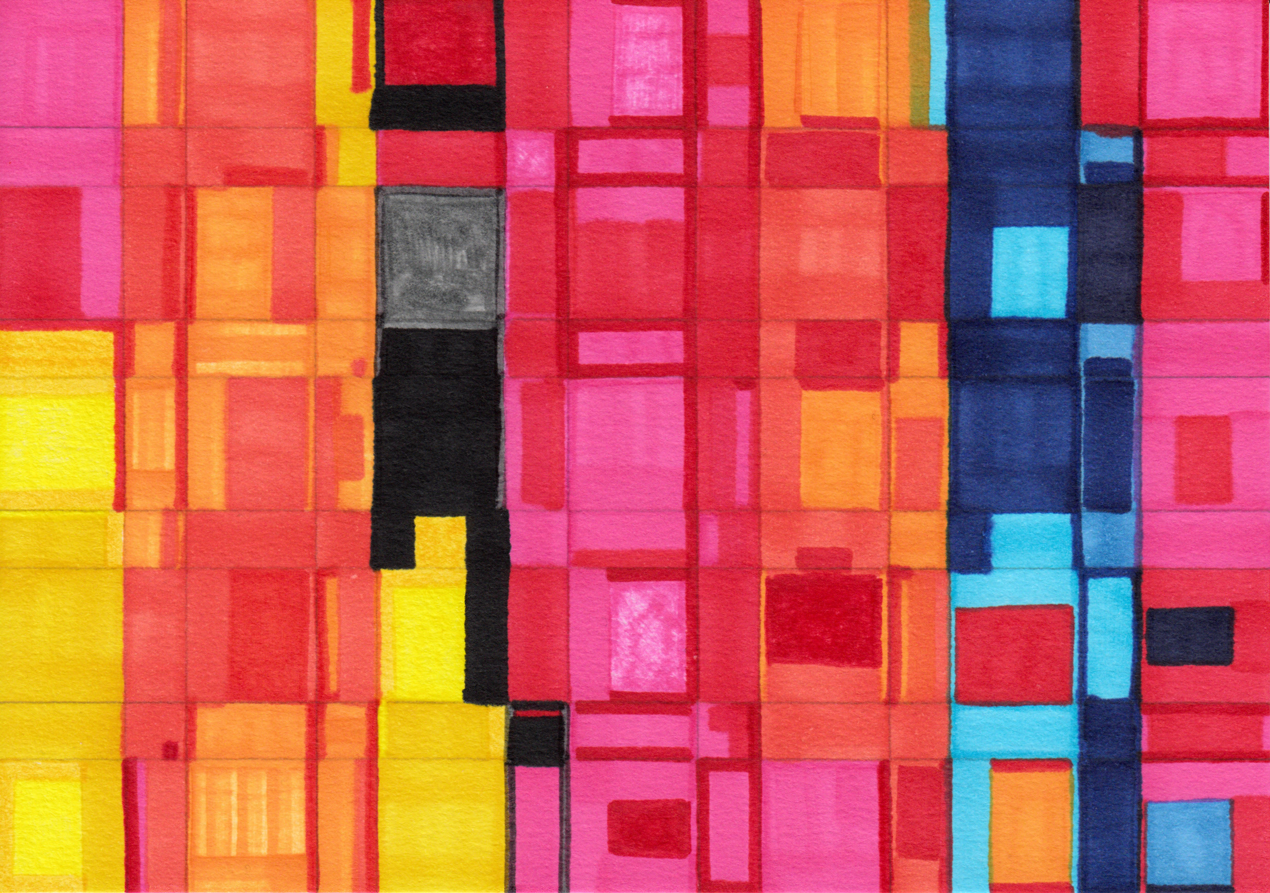 City Sunset: Our journey begins with an abstract geometric ink pen drawing on canvas paper. Unlike my usual work, this piece stretches beyond my typical dimensions, standing boldly at 10 x 12 inches. With hues reminiscent of a sunset embracing a city skyline, this piece invites viewers to ponder the interplay of light and architecture.