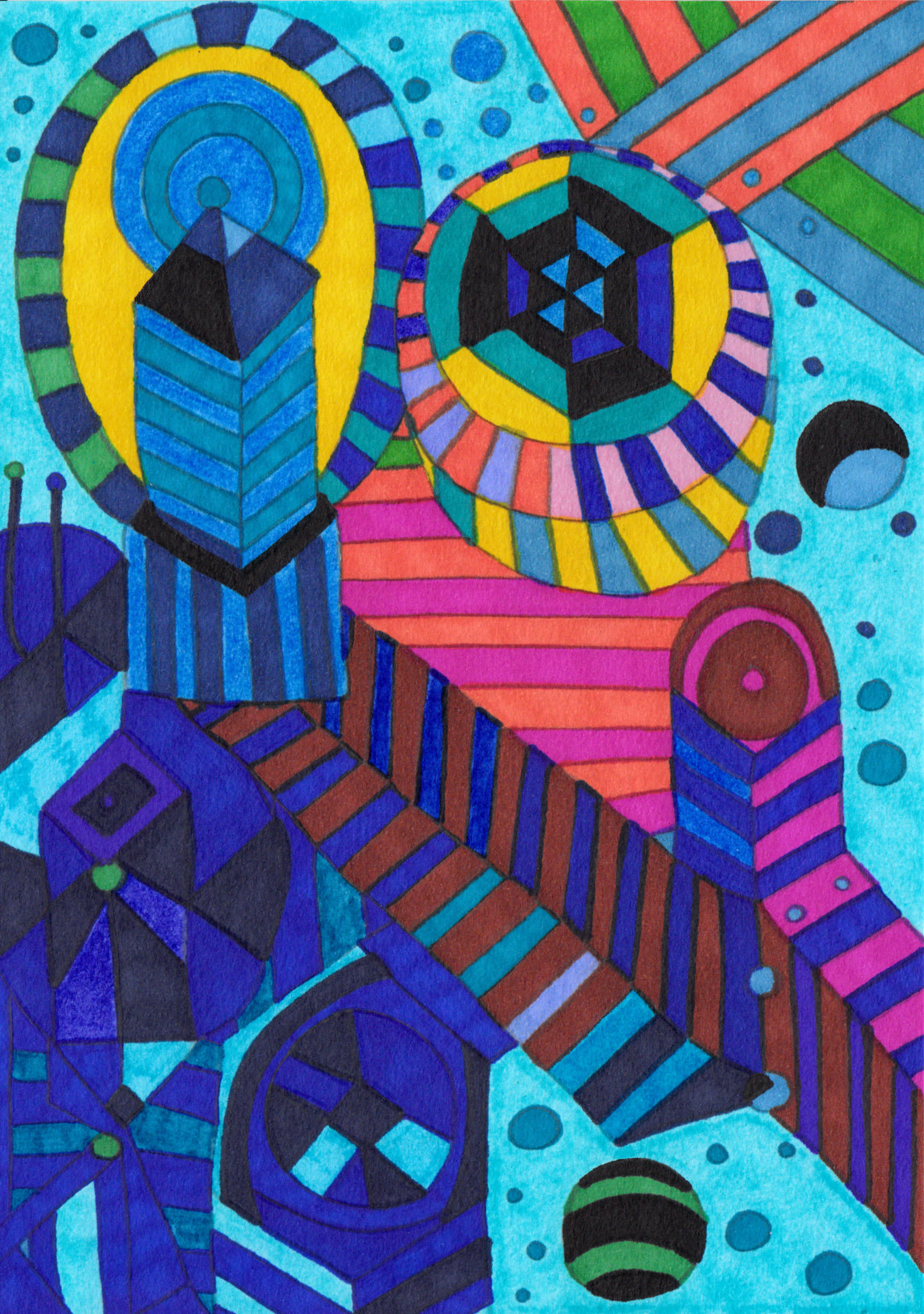 Shades of Blue: Venturing into a realm of endless possibility, our next abstract geometric drawing unfolds with intricate detail and a rich palette dominated by shades of blue. While still rooted in geometric abstraction, this piece ventures into uncharted territory.