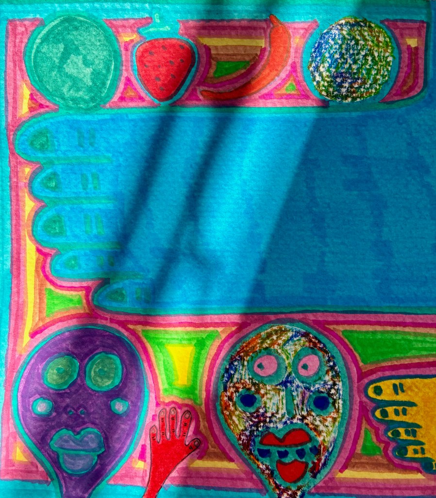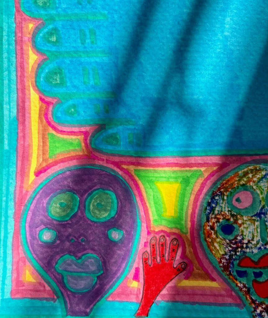 Some of the smaller details reveal themselves slowly. A red hand raises a wave. Mask-like heads stare with wide, alien eyes.