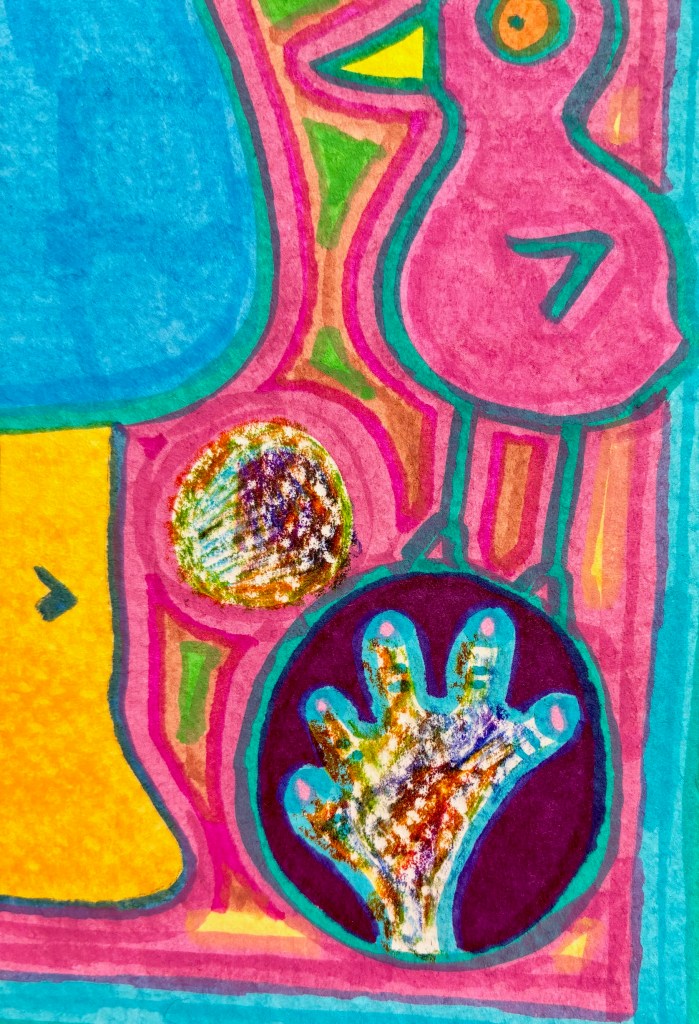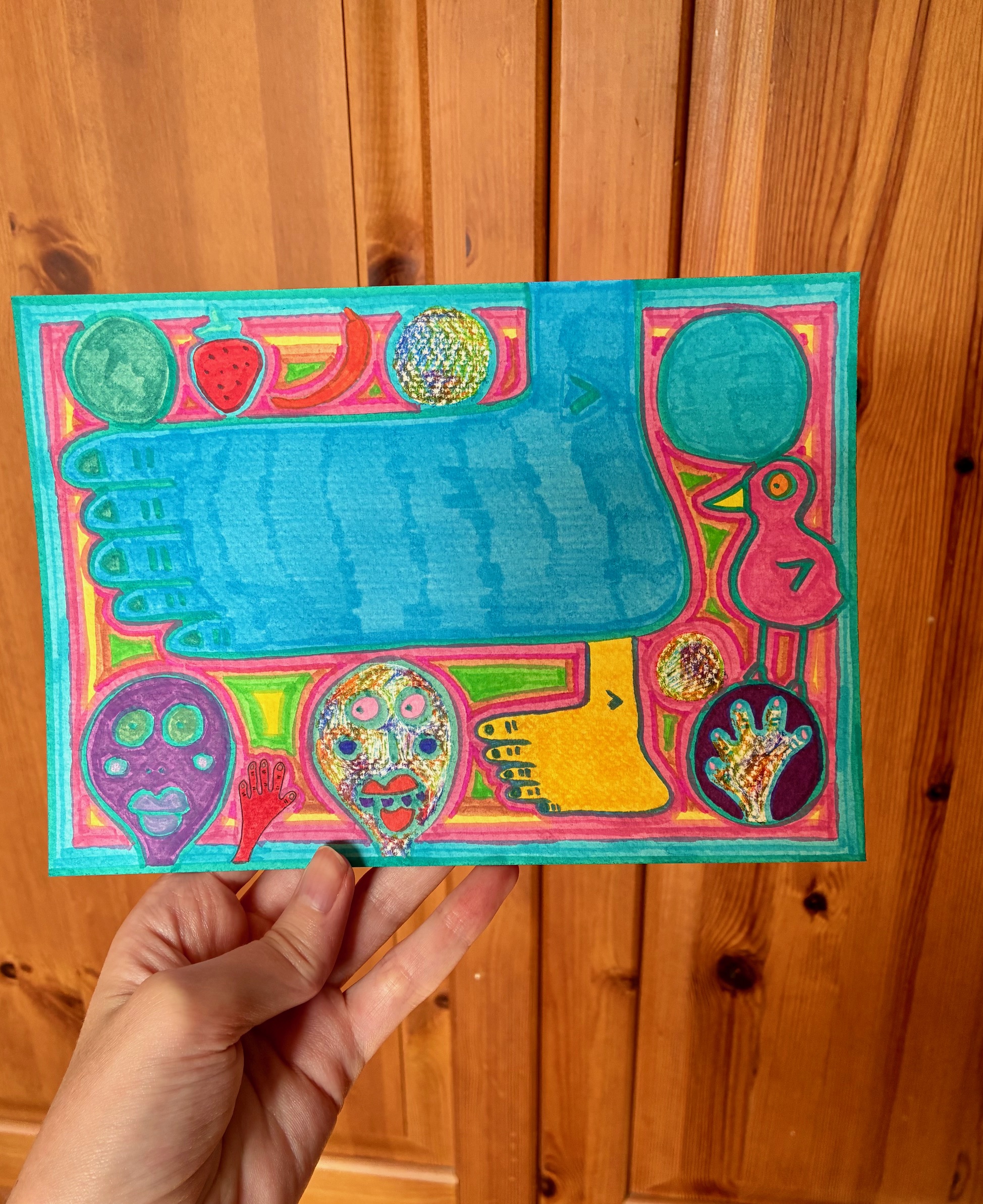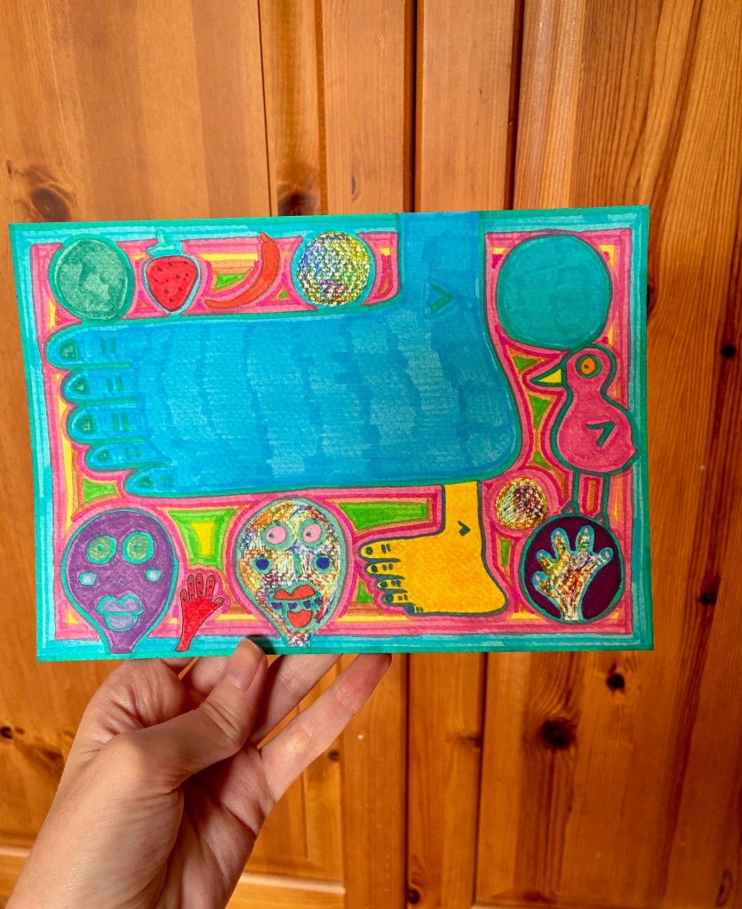 This new drawing feels like a wild mixture of playfulness and strangeness. At its centre sits a huge blue foot, filling the space like an oversized stamp.